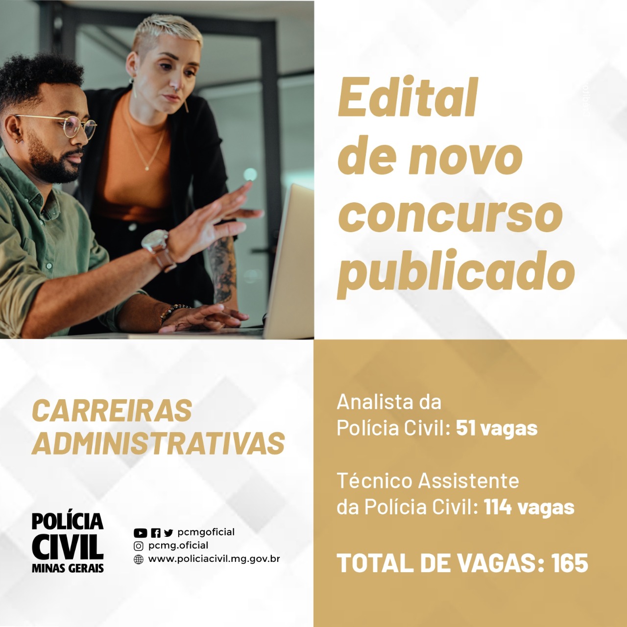 A Polícia Civil de Minas Gerais (PCMG) publicou, na manhã desta quarta-feira (6/4), dois editais para os concursos públicos destinados ao provimento de cargos das carreiras administrativas da instituição. Ao todo, serão disponibilizadas 165 vagas, sendo 51 para o cargo de analista da Polícia Civil (nível superior) e 114 para técnico assistente (nível médio).