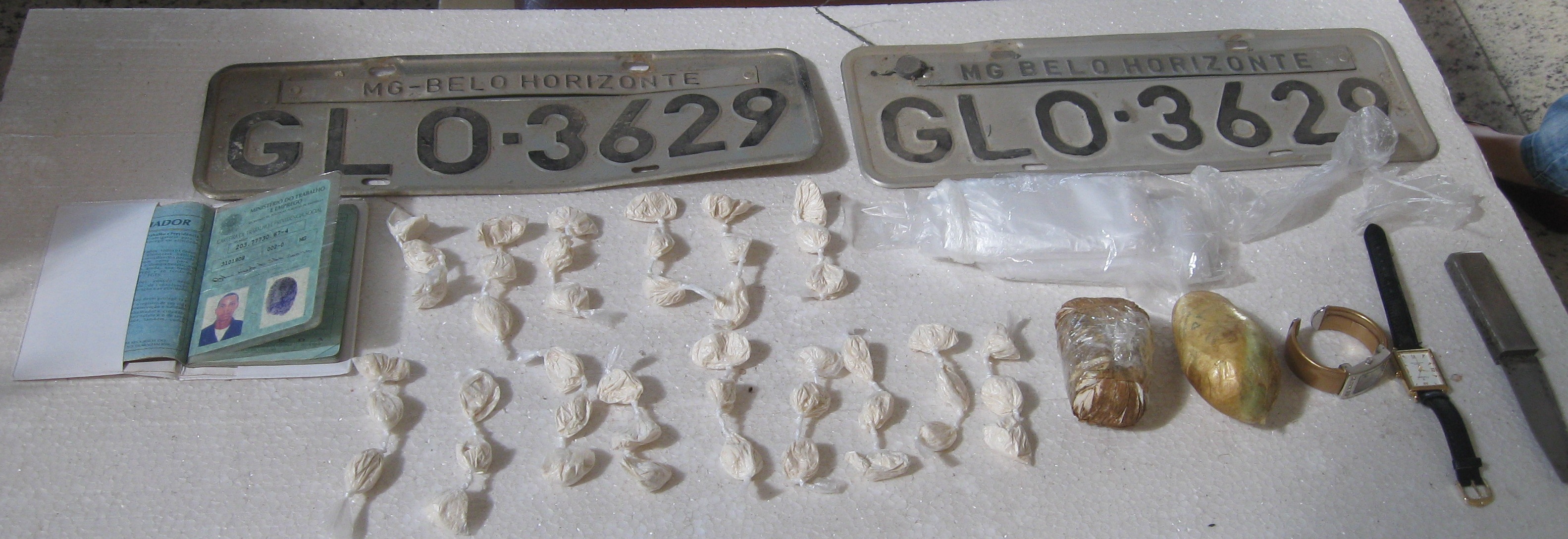 D.M.S.S., 22, já tinha passagem pela polícia por tráfico de drogas, associação para o tráfico e porte ilegal de arma de fogo. Com ele foram apreendidas aproximadamente 400 gramas de cocaína, material para dolagem de entorpecentes, um veículo, duas placas de veículos, um rádio de procedência duvidosa e uma carteira de trabalho.