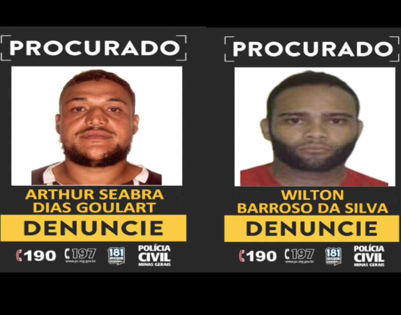 A PCMG solicita informações que levem à localização e prisão de Arthur Seabra Dias Goulart e Wilton Barroso da Silva.